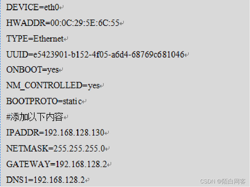 ③修改 /etc/sysconfig/network-scripts/ifcfg-eth0,修改设备名(eth0)、HWADDR、IPADDR以及注释掉或删除UUID开头的一行代码。 执行命令:vi /etc/sysconfig/network-scripts/ifcfg-eth0