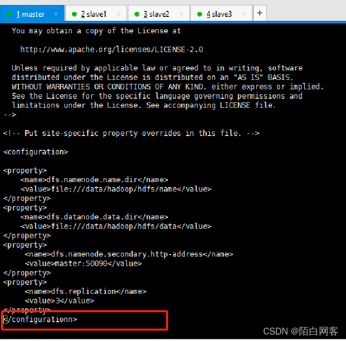 在salves文件里面添加代码。 slave1 slave2 slave3