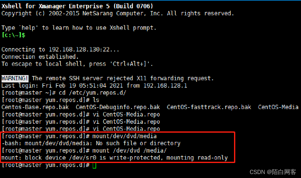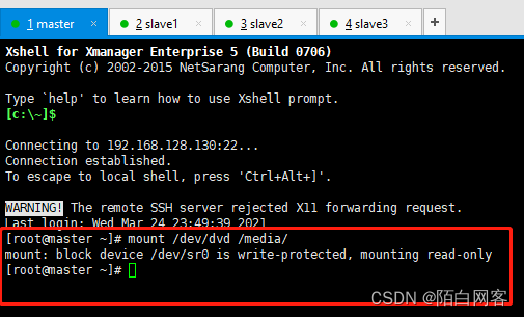 再次执行挂载命令。执行命令“mount /dev/dvd /media”,如下图,返回mount:block..... 信息提示,代表挂载成功