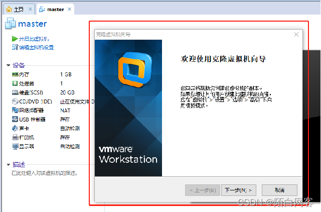 2.3.2 克隆虚拟机 在虚拟机master上配置完成hadoop之后,将虚拟机master克隆,生成3个新的虚拟机slave1、slave2、slave3。在虚拟机master的安装目录下建立3个文件slave1、slave2、slave3。 下面克隆master,生成slave1为例。 (1)将master处于关机状态。右键单击虚拟机master,选择“管理”——“克隆”命令,来到欢迎使用克隆虚拟机向导的界面,直接单击“下一步”按钮。