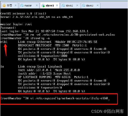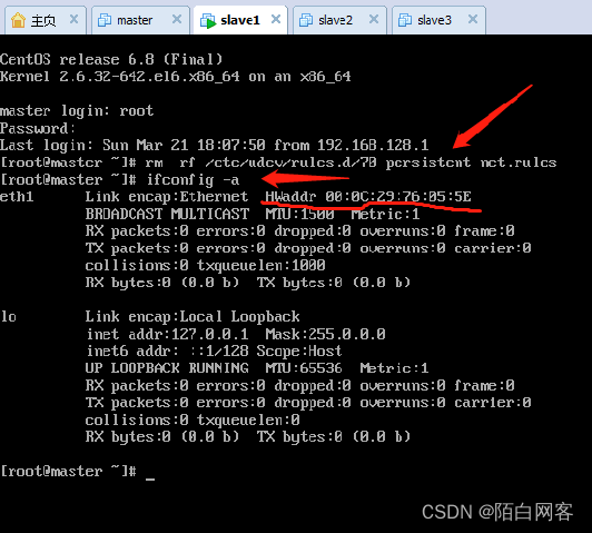 (5)开启虚拟机slave1,修改相关配置。进入slave1的用户名和密码,和master一样。 ①执行命令:rm -rf /etc/udev/rules.d/70-persistent-net.rules 删除 /etc/udev/rules.d/70-persistent-net.rules 文件。 ②执行命令:“ifconfig -a”,查看 HWADDR,记录下新虚拟机的 HWADDR 为 00:0C:29:76:05:5E