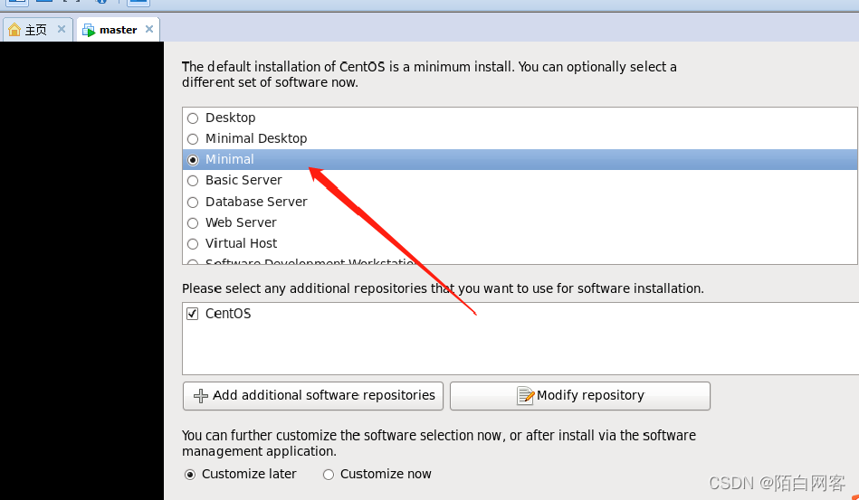 选择安装Centos组件,这里选择“minimal”. 提示:centos的默认安装是最小安装。您现在可以选择另一套软件。 在这里我们选择minimum 最小号版本,最小号版本需要加载的东西比较少一点。然后点击下一步,就开始安装了。 please select any additional repositories that you want to use for software installation:请选择要用于软件安装的任何其他存储库