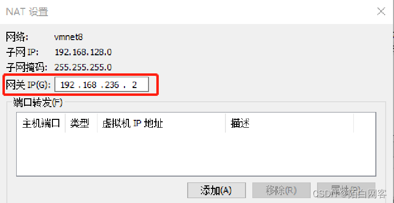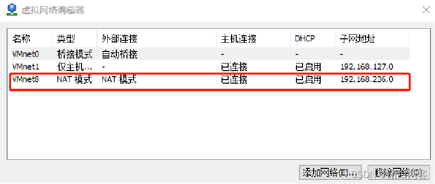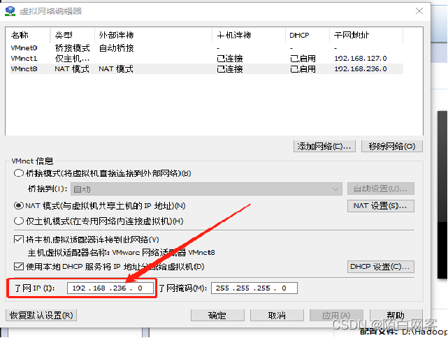 选中 VM8 NAT模式,然后我们找到它的子网IP,可以看到它现在的IP和我们虚拟机设置的固定IP(192.168.128.130)不在同一个网段,所以它连接不上,那我们把它修改到一个网段,将236修改成128