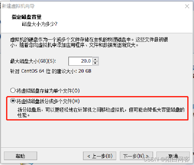 这里是选择磁盘的容量的,如果你的磁盘太小的话,也可以降低一点。然后选择将虚拟磁盘拆分成多个文件,点击下一步。