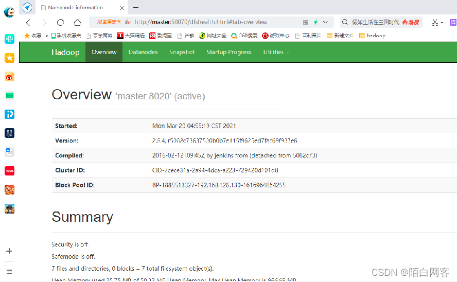 为了能够顺利在浏览器打开Hadoop集群相关服务的监控界面,需要修改本地hosts文件。本地的hosts文件可在 C:\Windows\System32\drivers\etc下找到,之后再文件末尾添加如下代码。 192.168.128.130 master master.centos.com
