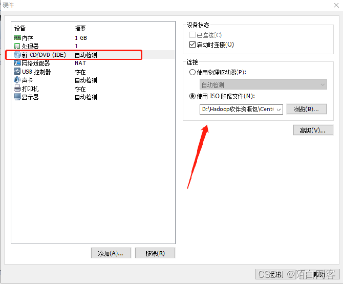 4、挂载。执行命令“mount /dev/dvd /media” 如果返回 mount:you must specify the filesystem type 的信息提示,说明挂载没有成功。解决方案:打开虚拟机,然后右击master找到“设置”命令,在“虚拟机设置”对话框中的“硬件”选择“CD/DVD(IDE)”在右边设备状态点击“已连接”。
