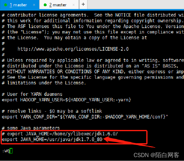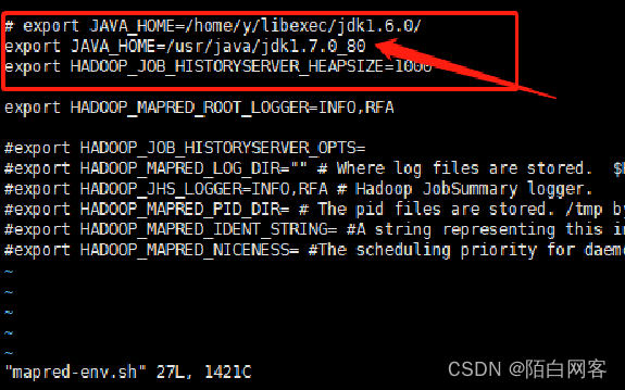 (7)修改yarn-env.sh文件。该文件是YARN框架运行环境的配置,同样需要修改为JDK所在位置,也就是在该文件中修改 JAVA HOME值为本机安装位置。 执行命令:vi yarn-env.sh