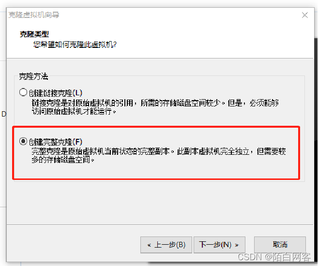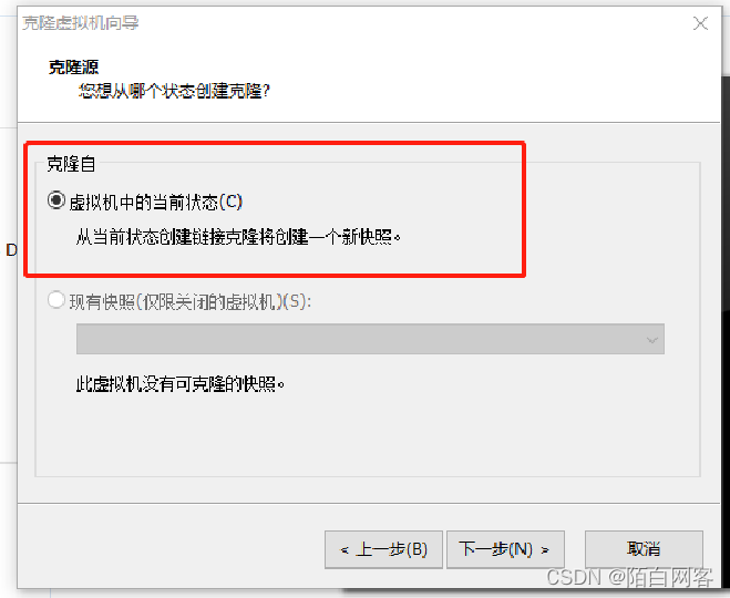 2)选择克隆源。这里选择“虚拟机中的当前状态”按钮。