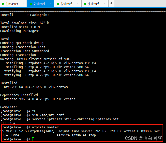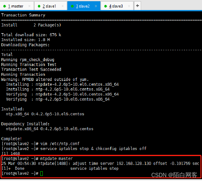 ②在slave1、slave2、slave3上执行命令“ntpdate master”,即可同步时间,如图所示