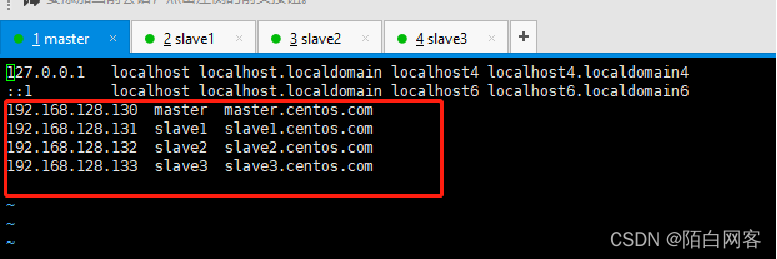 插播 修改ip与hostname映射,在节点(master、slave1、slave2、slave3)修改 vi /etc/hosts文件。 执行命令 vi /etc/hosts