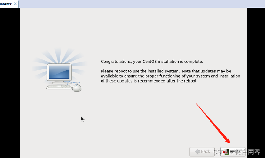 等它下载完了,就出现以下界面,然后它的右下角有一个 按钮,点击这个按钮,重启虚拟机。