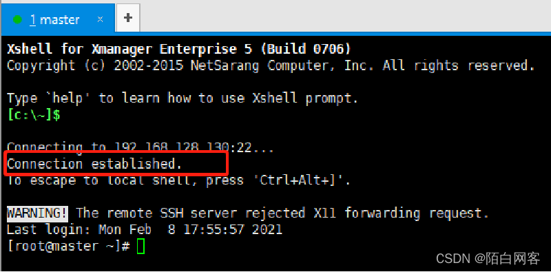 重新设置完成之后,接下来我们再打开Xshell窗口再判断一下进行连接,看看能不能连接上。 现在我们看到如下图,就是已经连接上的。