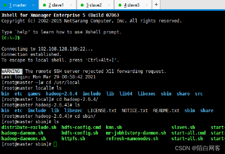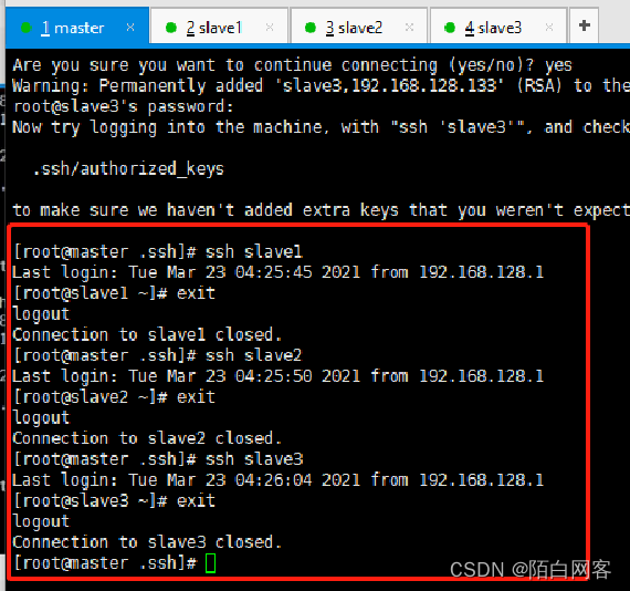 (3)验证SSH是否能够无密钥登录。 在master下分别输入ssh slave1、ssh slave2、ssh slave3,如图所示,说明配置SSH免密码登录成功。