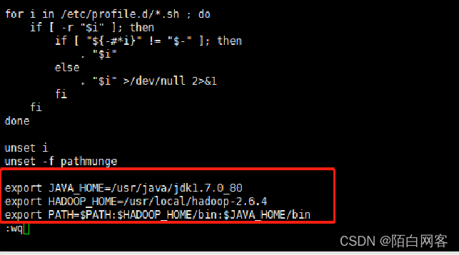 export HADOOP_HOME=/usr/local/hadoop-2.6.4 export PATH=$PATH:$HADOOP_HOME/bin:$JAVA_HOME/bin (路径之间用冒号分割)
