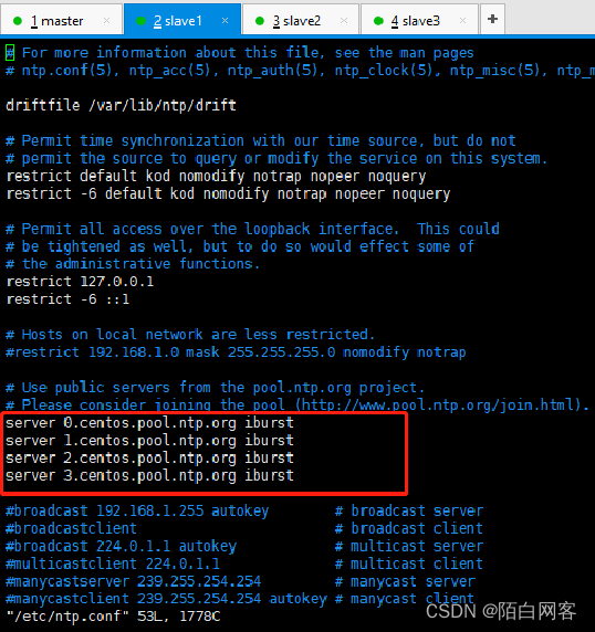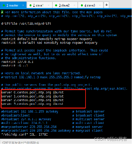 (3)分别在slave1、slave2、slave3中配置NTP,同样修改/etc/ntp.conf 文件,注释掉server开头的行,并添加代码