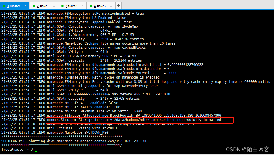 格式化执行命令:hdfs namenode -format 若出现 common storage ,则格式化成功。如图。