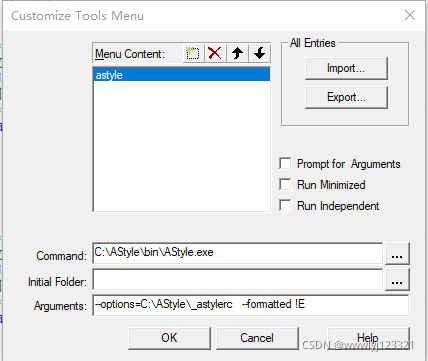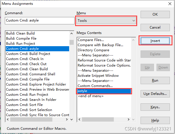 输入完成点击Menu按钮,弹出如下窗口,insert一个名为“astyle”的标签到Tools菜单栏(添加到菜单栏可以根据自己的喜好定制)