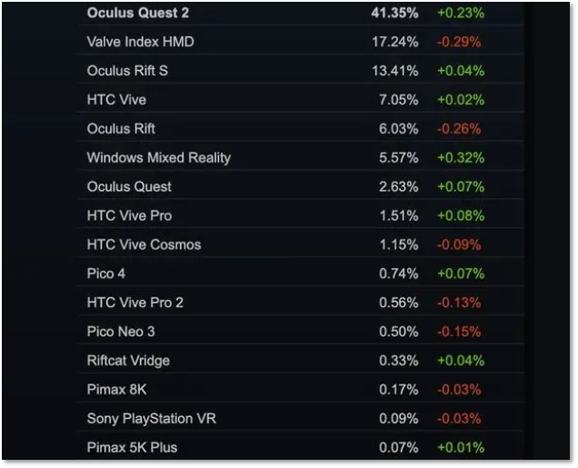 售价过高直接让HTC 在VR最常见的游戏场景中失利。根据2022年12月SteamVR的统计数据,在这一主流VR平台中排名前三的活跃设备分别是Oculus Quest 2、Valve Index HMD以及Oculus Rift S,三者合占了72%的份额。HTC VIVE排在第四位,有7.05%的平台玩家使用该产品,VIVE Pro占比为1.51%。