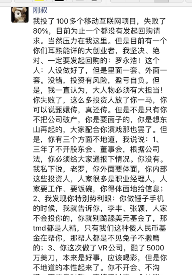 导致郑刚朋友圈“炮轰”的最后一根稻草是,罗永浩团队告诉他很多投资人都已经签署协议。但实际并非如此。