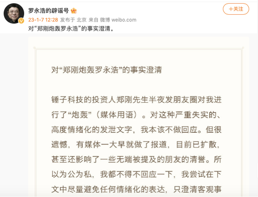 郑刚期待罗永浩是一个对员工、投资人都负责的“大人物”,深耕做好一行。在过往的交流中,他们也维持着体面。
