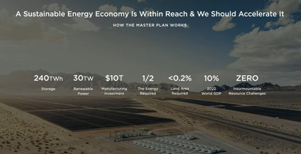 马斯克在不久之前,已经为“Master Plan Part 3”冠上了限定语——可持续能源之路。而这次投资者大会,实现这一计划的指标要求和方式,被完全披露。