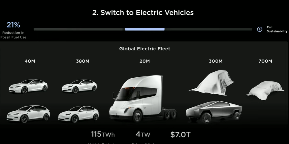 第二部分:电动汽车快速铺开。为此,马斯克给出的小目标是达到年产2000万辆电动汽车,期限是2030年。他认为,目前正在加速迈向电动化的未来,未来电动汽车在能源使用方面是更为高效的。