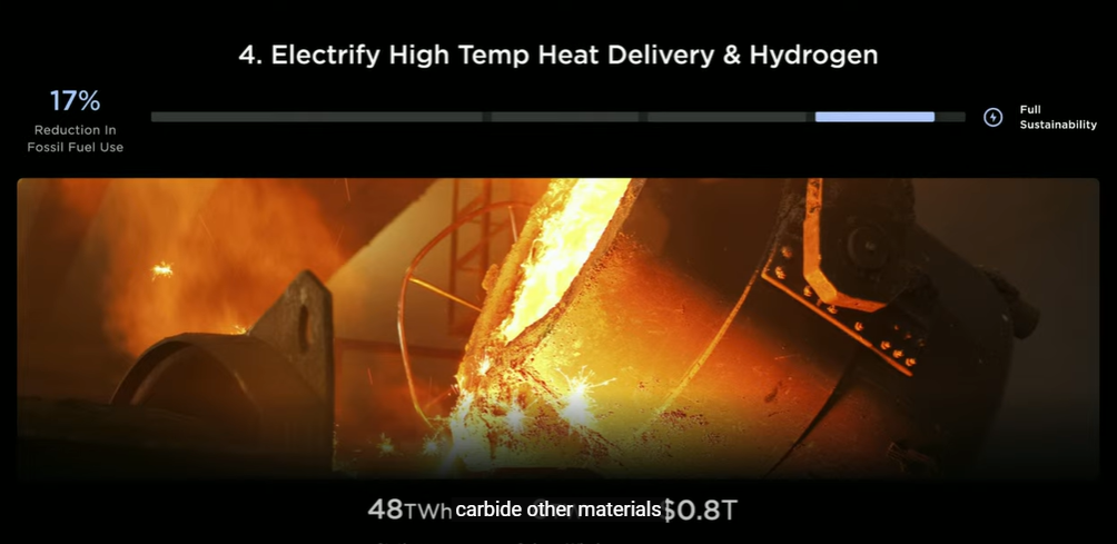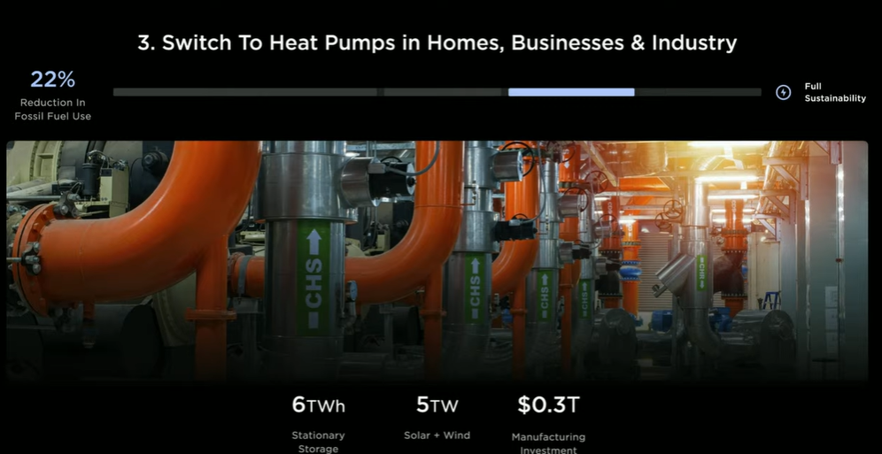 第三部分:从家庭到企业再到工业生产,应用热泵技术,提升能源使用效率。马斯克称,热泵本身非常高效,目前它的安装率同比增长10%,主要是用于建筑供暖大概占了10%,且还有很大进步空间。