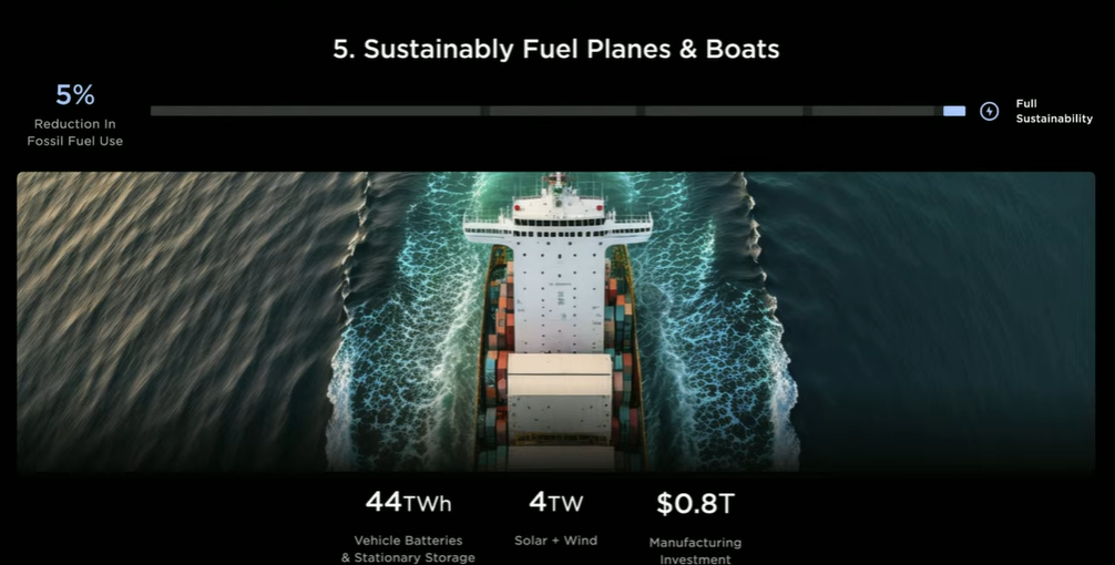 第五部分:用可再生能源驱动现有电网,实现完全可持续能源之路,届时不光是车,水里游的(船)天上飞的(飞机)都能使用电池进行驱动。