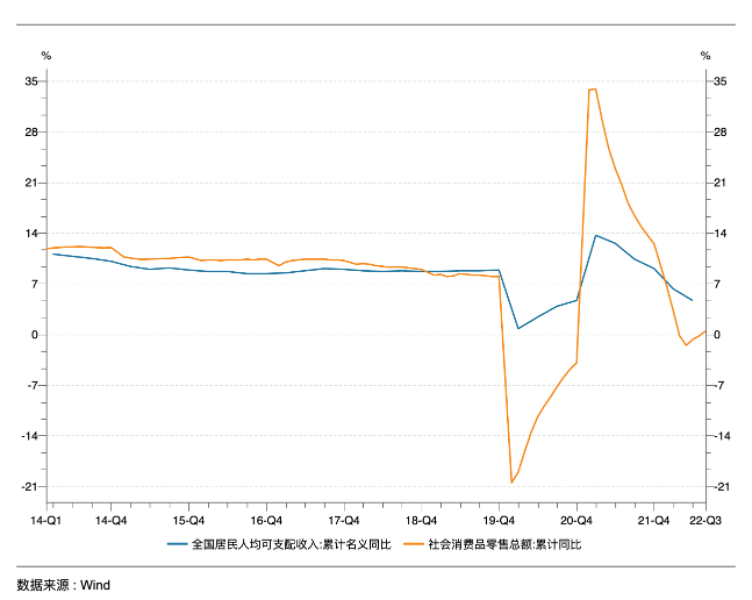 我们整理了2014年至今我国人均可支配收入与社会消费品零售总额(以下简称“社消”)的累计同比增长情况,见下图