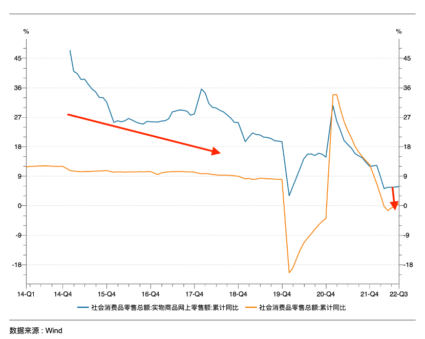 当前随着居民部门消费预期的转换,严重扰乱了社消的正常发展轨迹,不仅大盘面临负增长压力,且线上与大盘增速差更跌落至历史新低,当线上这一社消增长引擎动力不再之时,社消这一巨轮也是疲惫不堪。