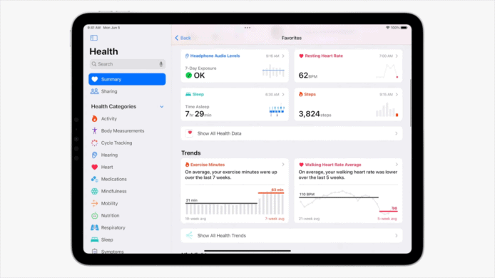 Apple 今次亦將健康(Health)App 加入 iPadOS中,以便用戶可以一站式查看 iPad、iPhone 和 Apple Watch 以及兼容的第三方應用程序和設備的信息地方。