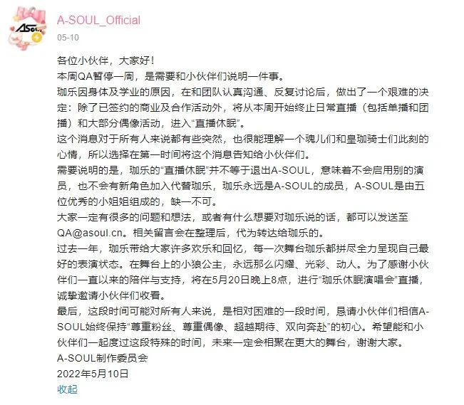5月10日,A-SOUL官方账号突然发布消息,表示旗下成员“珈乐”将从当周起进入“直播休眠”,终止日常直播和绝大部分偶像活动。