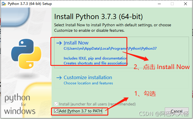 2、打开后,所示弹框如下,我们勾选 Add Python 3.7 to PATH、再选择 Install Now 进行安装