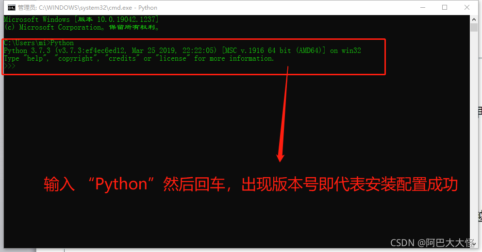 5、退出后 Win+R 输入 cmd 然后 回车(Enter) ,小黑框内输入 Python 然后回车,查看环境配置是否安装成功!(图1为成功所示界面,图2为失败所示界面,需要重新安装)