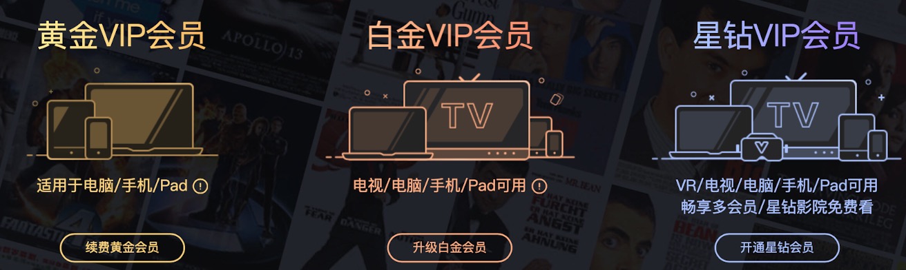 《消费钛度》了解到,爱奇艺目前包含黄金VIP会员、白金VIP会员、星钻VIP会员,其中黄金VIP会员可在手机、电脑、平板上使用,观看爱奇艺VIP内容,享受相应权益;白金VIP会员可在电视、手机、电脑、Pad、车载、智能家居端使用,观看爱奇艺VIP内容,享受相应权益;星钻VIP会员:可在电视、手机、电脑、Pad、车载、智能家居端、VR端七端使用,观看爱奇艺VIP内容。