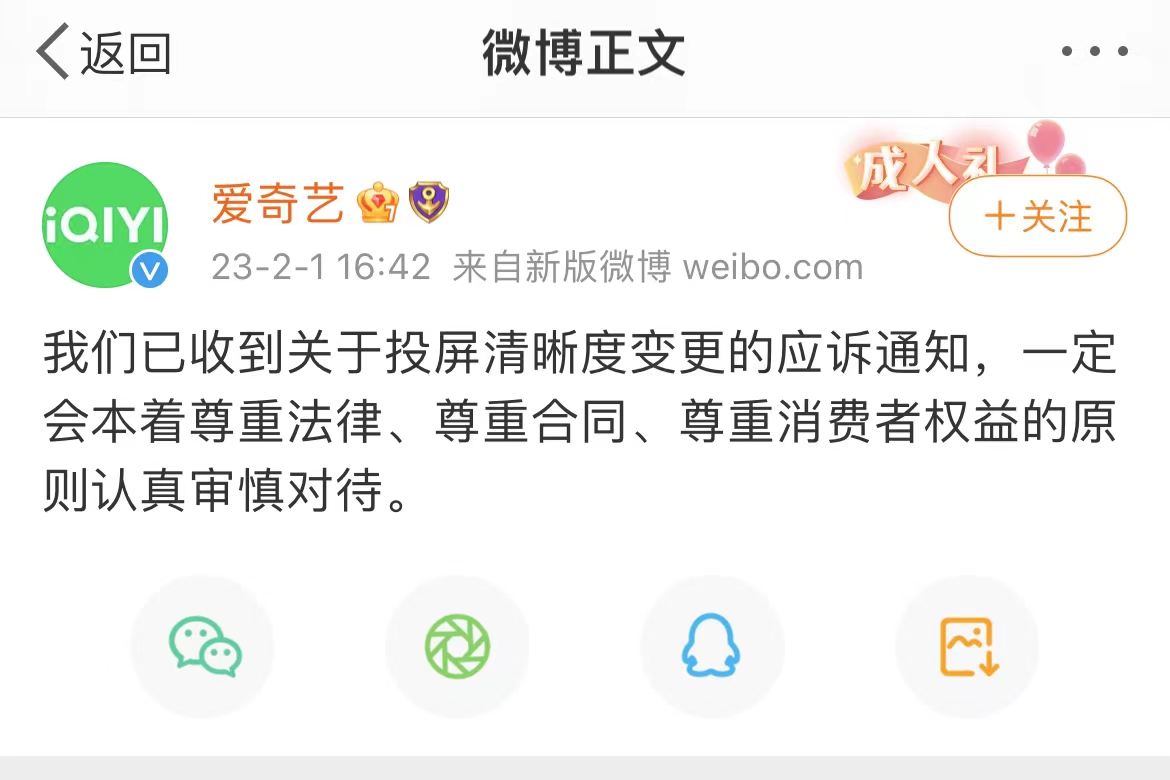 2月1日,#爱奇艺因限制投屏被起诉已立案#的消息冲上微博热搜第一。当日,爱奇艺回应称,“我们已收到关于投屏清晰度变更的应诉通知,一定会本着尊重法律、尊重合同、尊重消费者权益的原则认真审慎对待。”