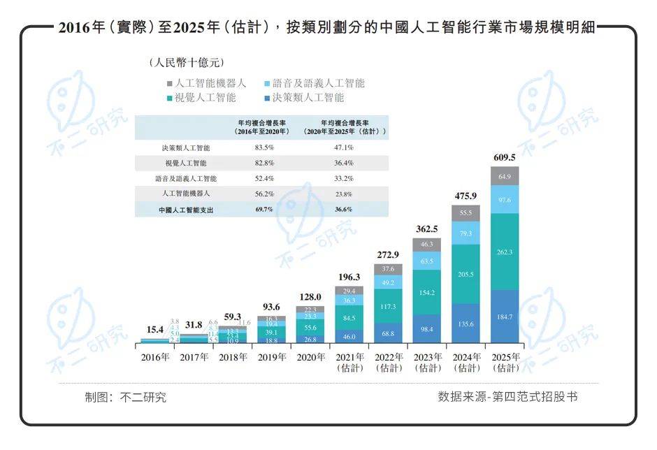 根据灼识咨询报告,2020年,中国人工智能支出达到1280亿元,预计于2025年将增长至6095亿元,年均复合增长率为36.6%。