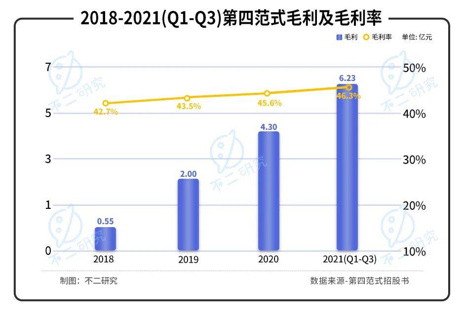 2018年~2021前三季度年,其营收分别为1.28亿元、4.6亿元、9.42亿元、13.45亿元;同期的毛利分别为0.55亿元、2.00亿元、4.3亿元、6.23亿元。