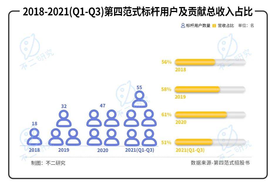 同期,第四范式分別服务18名、32名、47名及55名标杆用戶;标杆用户收入分別贡献总收入的56%、58%、61%及51%。近四年内,标杆用户的营收占比过半。