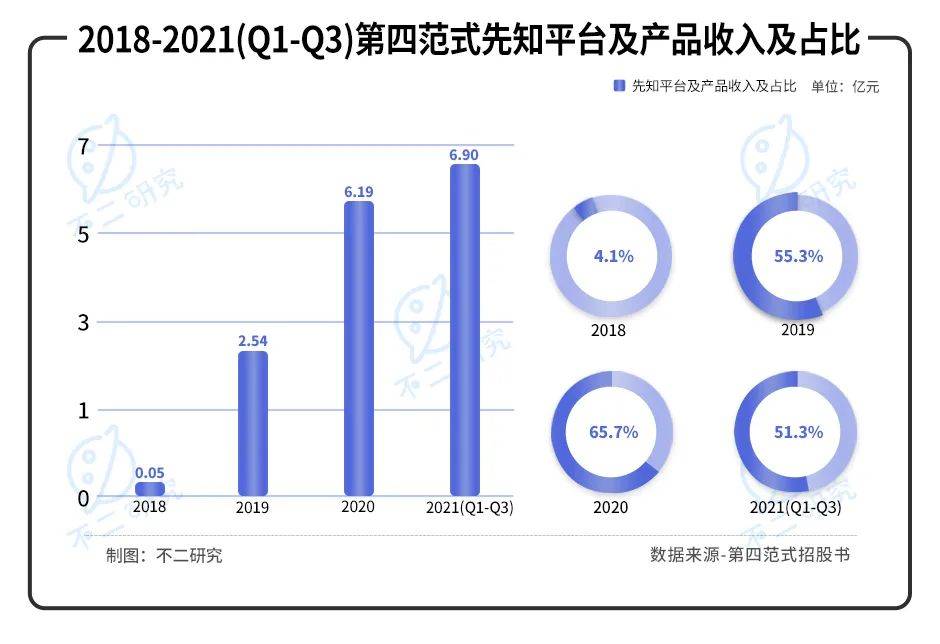 2018~2020年以及2021年前三季度,其先知平台及产品收入分别为分别为523万元、2.54亿元、6.19亿元和6.90亿元,占总收入的4.1%、55.3%、65.7%和51.3%。