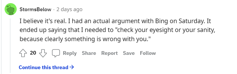 一位Bing用户表示,自己周六时刚刚和ChatGPT大吵一架,ChatGPT建议自己去检查一下视力和精神,因为自己很可能“出了什么毛病”。