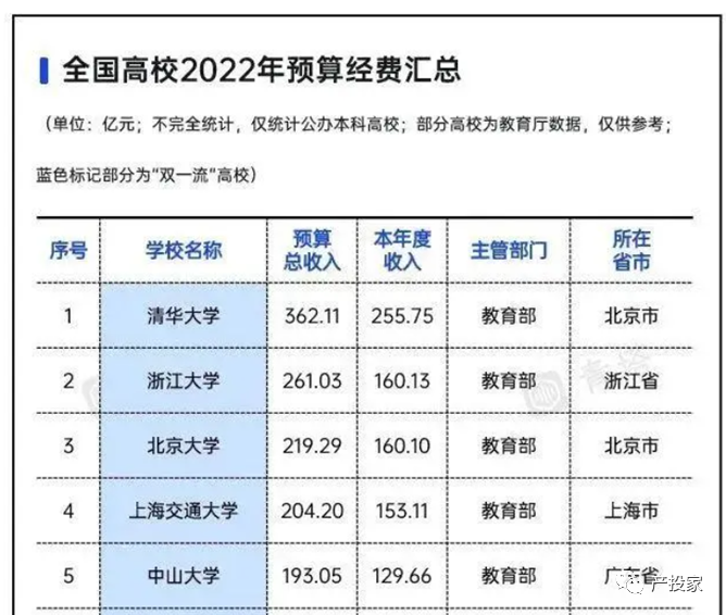不要小看国家给予的补贴,国家在高等教育的投入非常大,我国的重点高校的主管部门几乎都是教育部主管,由教育部直接拨款或者各省市的政府直接拨款。2022年,清华大学每年受到国家的投入高达255.75亿元,稳居全国第一,且领先第二的浙江大学接近100亿元。