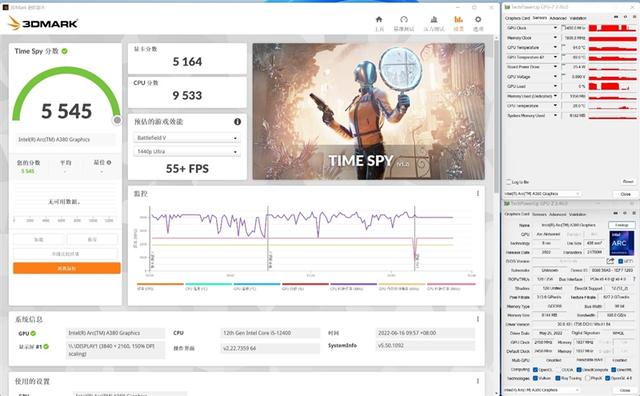 在跑分性能测试中,锐炫A380表现出了相当不错的基础素质。根据国内媒体测试,在3DMark Time Spy测试中,锐炫A380图形分数达到了5164分,非常接近桌面端RTX 3050的跑分成绩,跑分成绩远高于同定位的其他几块显卡,相比RX 6400和GTX 1650 D6能够领先40%左右,比起GTX 1050 Ti,领先幅度更是高达130%。