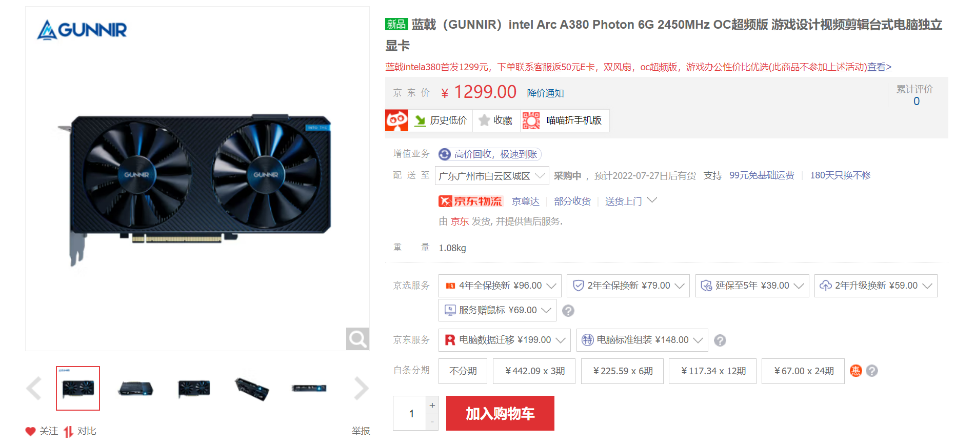 7月19日讯,在正式发布接近一个月后,英特尔锐炫A380独立显卡终于进入零售市场,首发厂商自然还是英特尔的核心合作伙伴——蓝戟。这张具体型号为蓝戟 Intel Arc A380 Photon 6G OC的显卡目前已经上架蓝戟京东自营旗舰店,官方售价1299元。