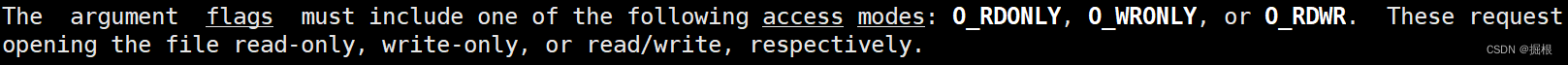 其实它就是一个整数,**一个整数有32个比特位**,将每一个比特位做为某一个选项,在对应的函数内看哪一位是否有数字,来判断我们是否传入了这个选项,**理论上flags可以传递32种不同的标志位。**大多数实现都把O_RDONLY定义为0,把O_WRONLY定义为1,把O_RDWR定义为2