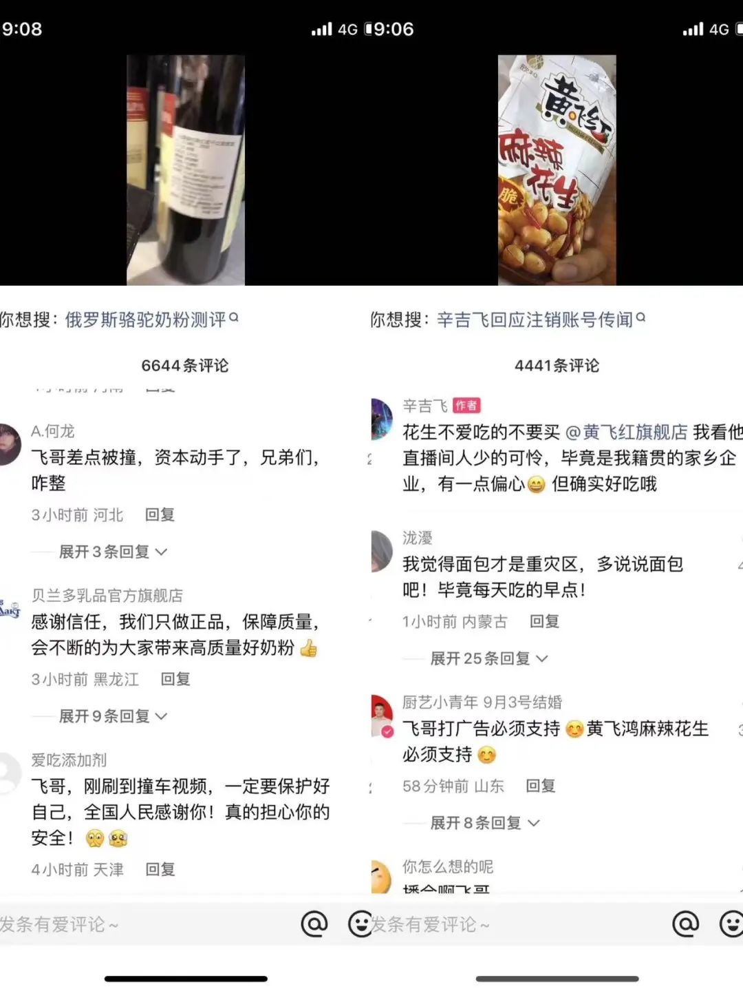 10月8日,辛吉飞的快手账号开始带货推荐商品,有黄飞红牌的花生零食,还有一些俄罗斯等国进口的商品。辛吉飞的粉丝们一边刷着“飞哥打广告必须支持”,一边担忧“飞哥差点被撞,资本动手了”。