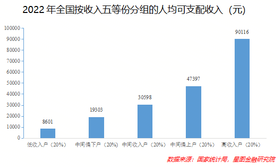 我国收入水平最高的前20%数量的居民,2022年的人均可支配收入为90166元,折合每个月约7515元,大幅度领先于其他80%的人;