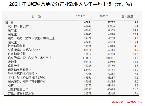 值得注意的是,私营单位就业人员的工资水平普遍要少于非私营单位。从数据上看,2021年城镇私营单位就业人员年平均工资为62884元,明显低于非私营单位的106837元;而对于工资水平最高的三个行业来说,私营单位就业人员每年要比非私营单位的就业人员足足少赚6~8万元。