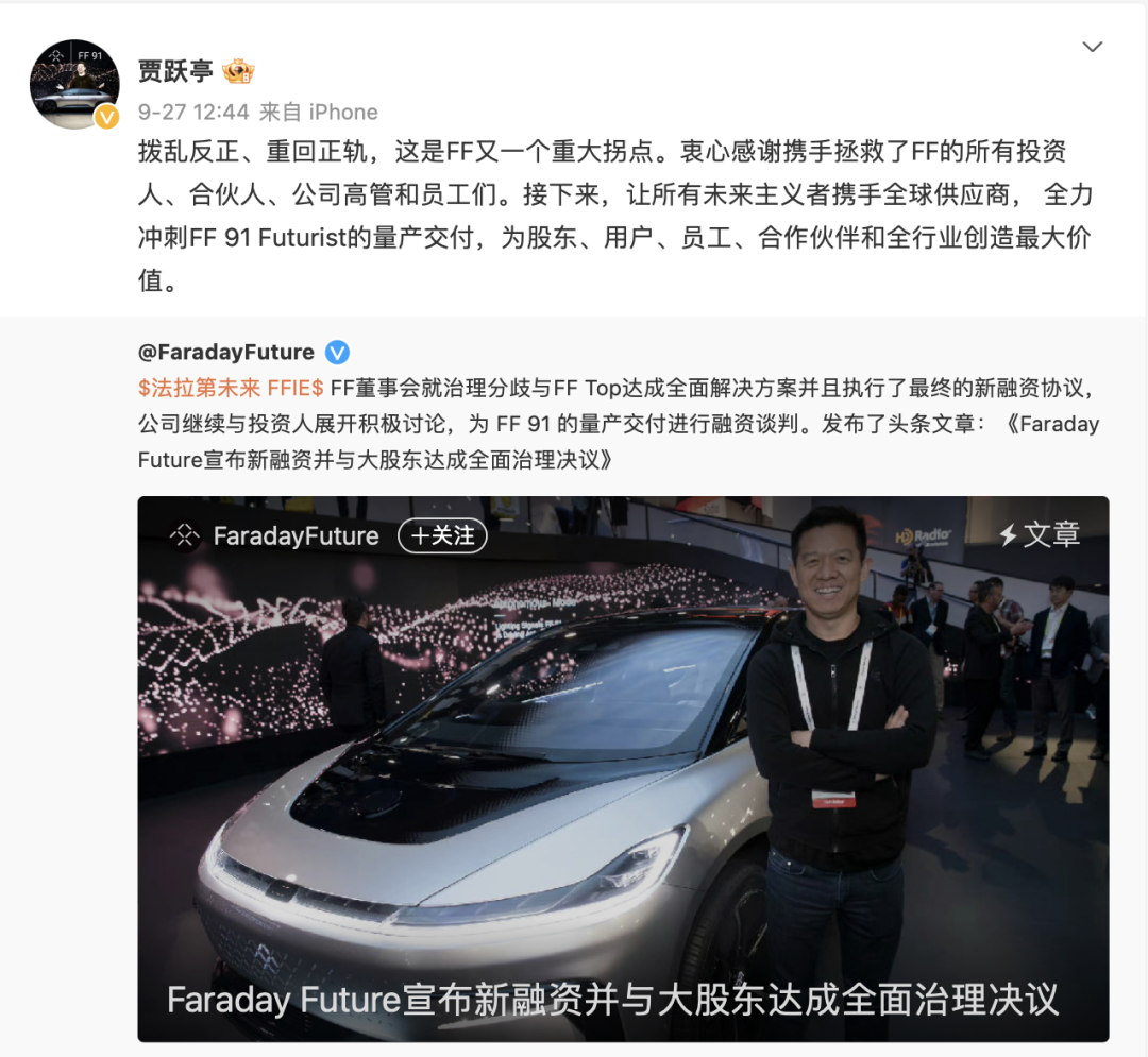 9月27日下午,数月未出现在公众视野的贾跃亭转发了FF发布的一篇名为《Faraday Future宣布新融资并与大股东达成全面治理决议》的通稿。决议中的重点便是,FF TOP撤回诉讼,同时FF会陆续分批收到总额为1亿美元的融资,届时公司董事苏珊・斯文森(Sue Swenson)和布莱恩·克劳利克将陆续辞去相应职务。