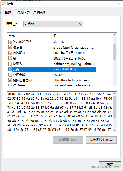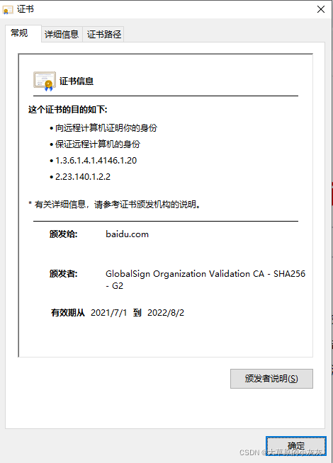 在常规界面可以看到,证书的颁发机构,使用者,有效期。百度使用的证书是GlobalSign颁发的。